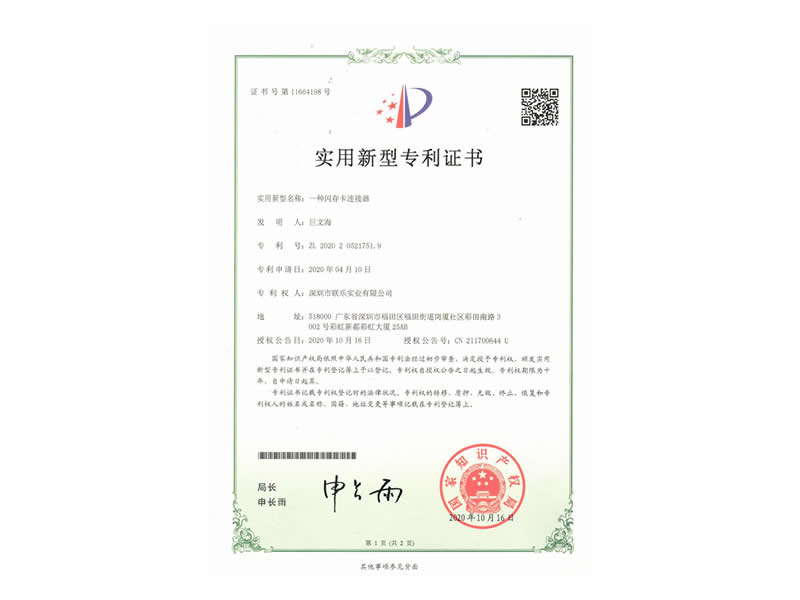 實用新型專利證書-一種閃存卡連接器